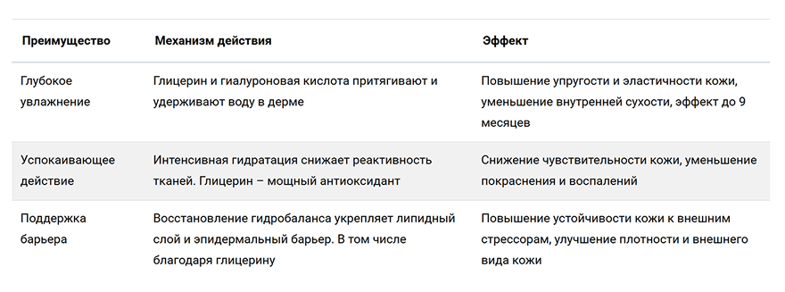 -Гиалуроновая кислота притягивает влагу в дермальный слой, стимулирует регенерацию и поддерживает здоровье кожи.